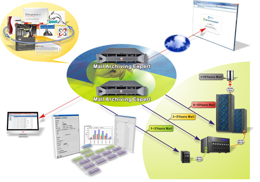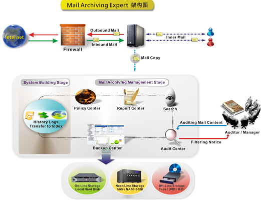 根據(jù)企事業(yè)單位的建置需求,Mail Archiving Expert采取Stand alone架構(gòu),不需更改現(xiàn)有網(wǎng)絡(luò)及郵件流架構(gòu),可迅速完成系統(tǒng)實(shí)施,與現(xiàn)有email相關(guān)設(shè)備及后端儲(chǔ)存設(shè)備的整合相容性佳,極適合各型企事業(yè)單位使用。針對(duì)email流量大的企業(yè)集團(tuán),可搭配Multi-way架構(gòu)做到分流或備援等顧問式服務(wù)。通過Mail Archiving Expert采用的Email Copy機(jī)制,進(jìn)行完整的郵件備份,支援Microsoft Exchange、 IBM Lotus Notes…等電子郵件服務(wù)器內(nèi)部郵件記錄,通過中央管理界面來迅速完成郵件歸檔策略設(shè)置、檢索及調(diào)閱等相關(guān)管理服務(wù)。