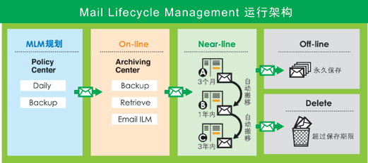 企業(yè)先制定郵件備份策略,先以年限一年、二年、三年、五年、永久作為基礎(chǔ),運(yùn)用MAE的「郵件生命周期」服務(wù),可將郵件內(nèi)容進(jìn)行備份期限的分類,并搭配整體或個(gè)別的管理策略,進(jìn)行歸檔、郵件檢索及調(diào)閱等工作。MAE「郵件生命周期」能符合策略將分類儲(chǔ)存的郵件進(jìn)行自動(dòng)搬移及后續(xù)處理,例如會(huì)自動(dòng)推移郵件的儲(chǔ)存年限,并將該郵件從MAE自動(dòng)搬移至遠(yuǎn)端儲(chǔ)存設(shè)備,避免硬盤空間不足影響相關(guān)運(yùn)作,還能減少系統(tǒng)負(fù)載及分散電子郵件的保存風(fēng)險(xiǎn)。